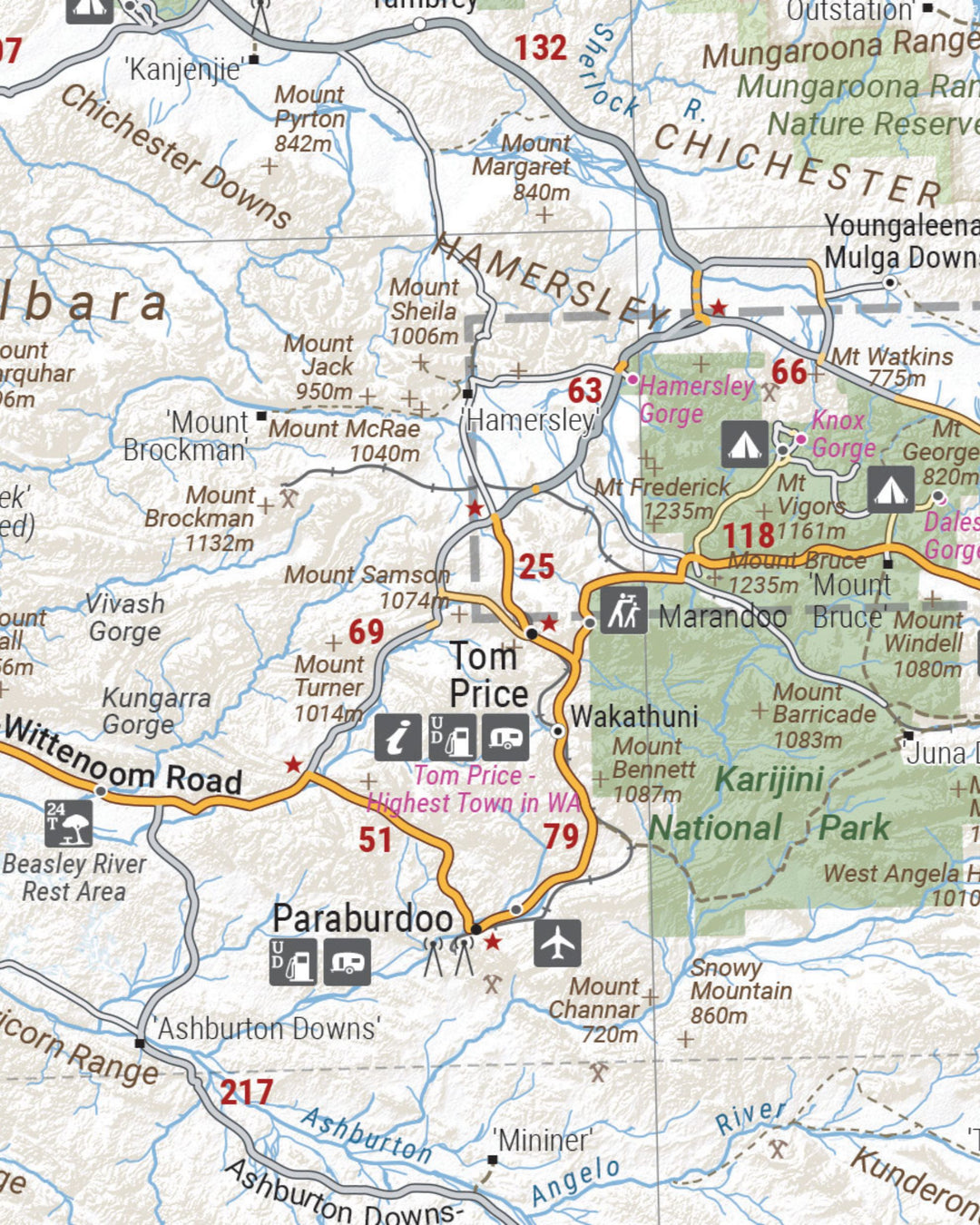From coastal drives along the Coral Coast to long outback journeys through the Pilbara and Kimberley regions, this map helps you navigate with confidence while highlighting key destinations and points of interest across the state.