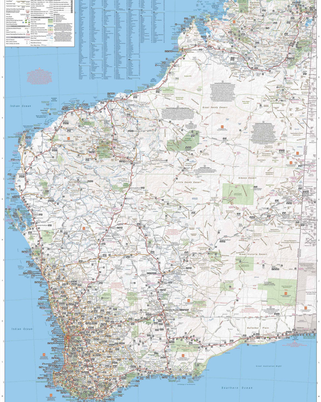Hema's updated WA State Map is comprised of the most detailed information, which has been verified by Hema Map Patrol. It is printed on waterproof paper and includes a full index of locations, making it durable and easy to use for both navigation and inspiration. On the reverse side of the maps are through road maps of Perth, plus inset maps of Leeuwin-Naturaliste National Park, Cape Range National Park, Nambung National Park, Francois Peron National Park, Purnululu National Park, Walpole-Nornalup National Park and Karijini National Park. Also included are information centres within Western Australia.